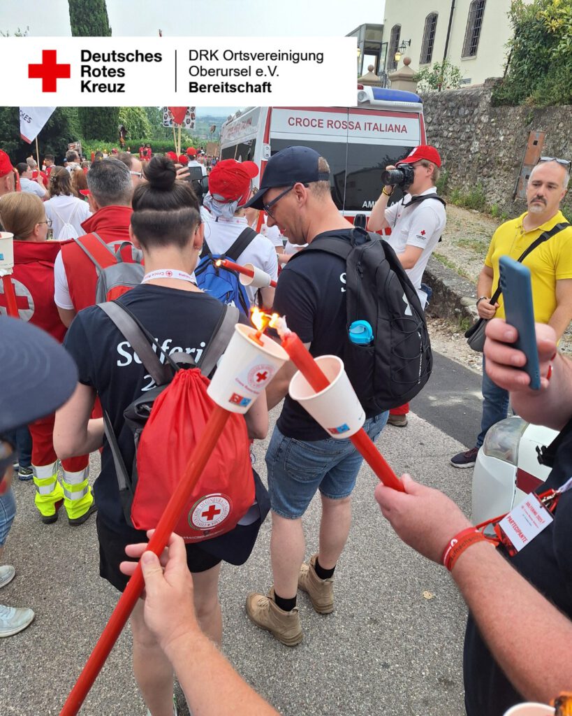 Jedes Jahr versammeln sich RotkreuzlerInnen aus aller Welt in Solferino, Italien, um der Gründung des Roten Kreuzes zu gedenken.Die Idee des Roten Kreuzes ist auf das Jahr 1859 zurückzuführen, in dem Henry Dunant Zeuge einer verheerenden Schlacht zwischen französischen/italienischen Truppen und dem Königreich Österreich/Ungarn wurde. Er unterstützte die dortige Bevölkerung bei der Versorgung der verwundeten Soldaten beider Seiten. Henry Dunant schrieb darüber das Buch „Eine Erinnerung an Solferino“ und verlegte dies auf eigene Kosten.Dieses Jahr waren drei Mitglieder der OV Oberursel mit der Delegation des Kreisverbandes Hochtaunus in Solferino mit dabei. Zusammen mit tausenden anderen RotkreuzlerInnen aus aller Welt zogen sie mit Fackeln von Solferino nach Castiglione. Auf diesem Weg wurden 1859 die verwundeten Soldaten zur weiteren Versorgung nach Castiglione gebracht.Bevor abends die Fiaccolata begann war die Gruppe im internationalen Rot Kreuz Museum.